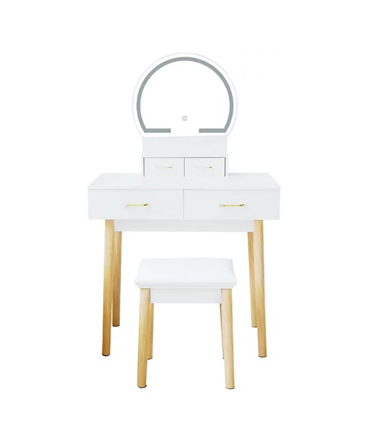 Dimensiones: 133 cm (Alto) x 81 cm (Ancho) x 41 cm (Fondo). Incluye: Tocador, espejo LED con 3 modos de color, taburete acolchado.
